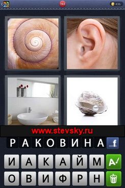 4 фото 1 слово ответы уровень 161: 1. Спираль 2. Ухо 3. Ванная комната 4. Ракушка с жемчужиной внутри 8 букв Правильный ответ - РАКОВИНА |