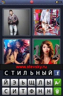 4 фото 1 слово ответы уровень 162: 1. Парень в клетчатой рубашке на сером фоне 2. Кто-то стоит на фоне разукрашенной стены 3. Две девушки танцуют в клубе 4. Девушка демонстрирует туфли 8 букв Правильный ответ - СТИЛЬНЫЙ |