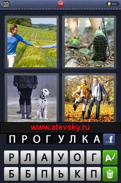 4 фото 1 слово ответы уровень 164: 1. Двое идут по заросшей травой тропинке, взявшись за руки 2. Ноги в кроссовках 3. Далматинец с хозяном на улице 4. Двое идут по осеннему парку, заваленному желтыми листьями 8 букв Правильный ответ - ПРОГУЛКА |