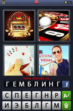 4 фото 1 слово ответы уровень 213: 1. Игральный автомат 2. Рулетка, шарик упал на 34 красное 3. Четыре туза 4. Парень с деньгами на фоне дорожного знака Welcome to Las Vegas 8 букв Правильный ответ - ГЕМБЛИНГ |