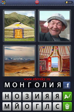 4 фото 1 слово ответы уровень 225: 1. Юрта, дом, хижина на фоне гор 2. Дед в шляпе 3. Горы, долина, пейзаж 4. Шатёр, дверь наружу 8 букв Правильный ответ - МОНГОЛИЯ |