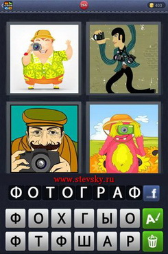 4 фото 1 слово ответы уровень 266: 1. Рисунок: толстый турист с фотоаппаратом 2. Рисунок: человек с несколькими фотокамерами 3. Рисунок: грузин с фотоаппаратом 4. Рисунок: какое-то животное или инопланетянин с фотокамерой 8 букв Правильный ответ - ФОТОГРАФ |