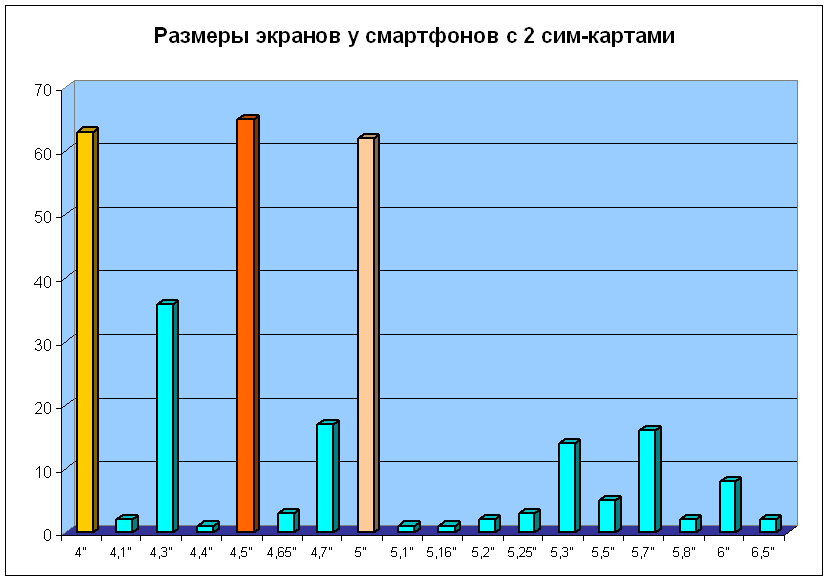 65 смартфонов имеют диагональ экрана 4,5" (оранжевый пик)