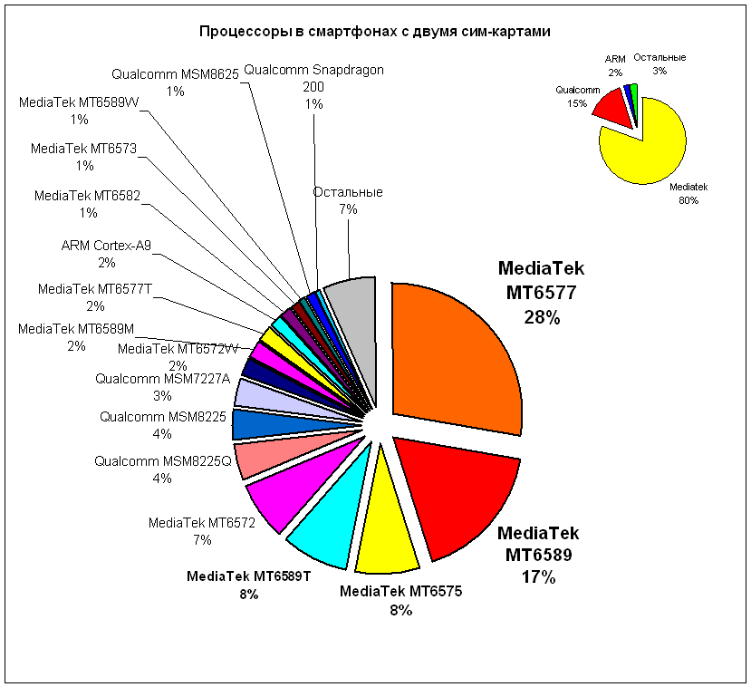 Как вы могли заметить, предпочтения в процессорах сборщики отдают китайскому производителю Mediatek. Доля смартфонов Mediatek в общей массе смартфонов с двумя сим картами составляет 80%. Qualcomm, имеющий в своём модельном ряду в три раза больше разных чипов, довольствуется лишь 15% данного предложения. Остальные 5% растащили ARM, в 2013 внезапно начавший выпускать процессоры самостоятельно, Samsung, Broadcom, NovaThor, Intel и пара малоизвестных китайцев. Будьте очень осторожны с такими смартфонами, как Qumo Quest 400 и Fly IQ449 Pronto - они работают на крайне ненадёжных китайских процессорах, лицензирование и сертификация которых до сих пор под вопросом!