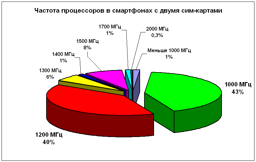 Ещё одна важная характеристика аппаратной начинки смартфона - это частота установленного в нём процессора. Более высокая частота означает более высокую производительность и позволяет запускать приложения и игры, требовательные к ресурсам. Частоту процессора, конечно, стоит рассматривать вкупе с количеством ядер, потому как одно ядро на 1200МГц будет проигрывать двум ядрам по 1000МГц, хотя между 2-х и 4-х ядерными системами зависимость уже гораздо более сложная. Поэтому рассмотрим просто частоту процессора!