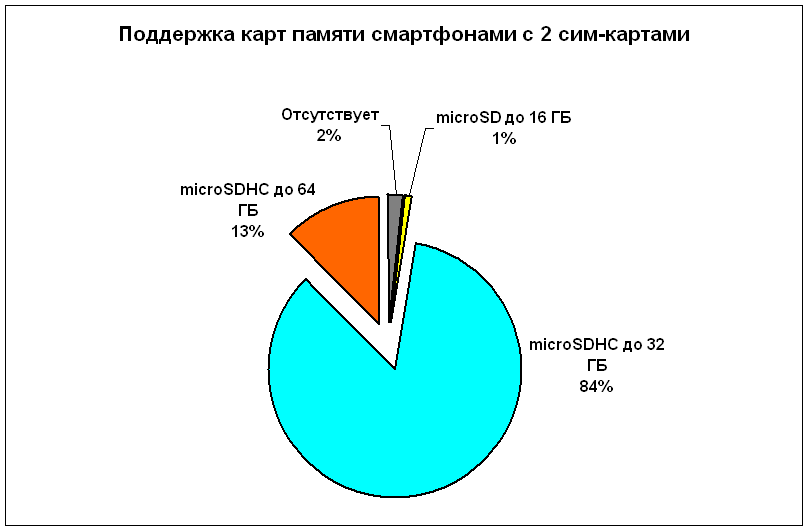 Смартфоны с двумя сим картами и встроенной памятью на 16 ГБ уже не столь популярны и составляют всего 4% от обозреваемого списка. Это счастливые тринадцать моделей, среди которых три смартфона Alcatel, два Explay и несколько прочих марок. Сей широкий жест по добавлению в смартфоны памяти компании производители часто нивелируют отсутствием слота под карту памяти: 6 из 13 устройств его не имеют! И это единственные шесть смартфонов из всей выборки, которые имеют столь неприятный изъян!