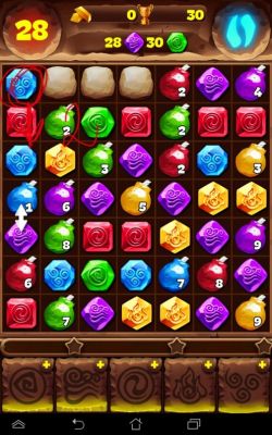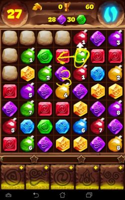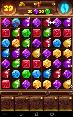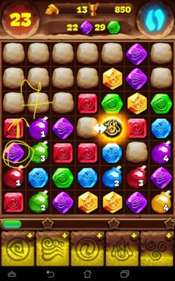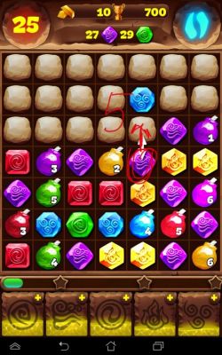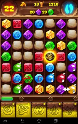 Избавляемся от препятствий земли, воды и огня с помощью тотемов, "расчищаем" середину поля и создаём комбинации камней из 4-х и больше камней, чтобы они затрагивали большее число самоцветов при взрыве, так очков удастся за один ход набрать больше, чем если просто по три самоцвета собирать