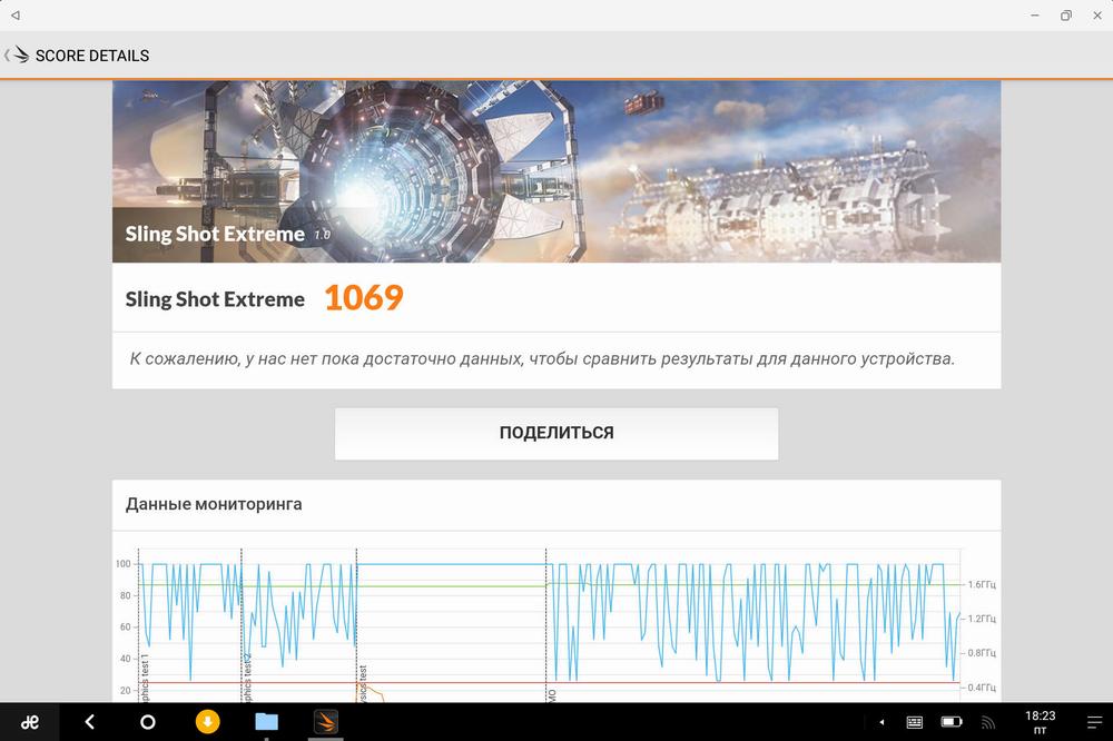 Протестировать производительность устройства получилось на Remix OS, поскольку на нее можно установить популярные бенчмарки Antutu, GeekBench и прочие. В тестере Антуту Intel Atom X5 Z830 позволил набрать планшету без малого 60000 баллов. Результат невелик, однако это связано с тем, что все работает в 32-битном режиме. На самом деле Chuwi Hi10 Plus способен на большее, поскольку тестер Sling Shot показал на табло более 1000 баллов, а это хороший знак.