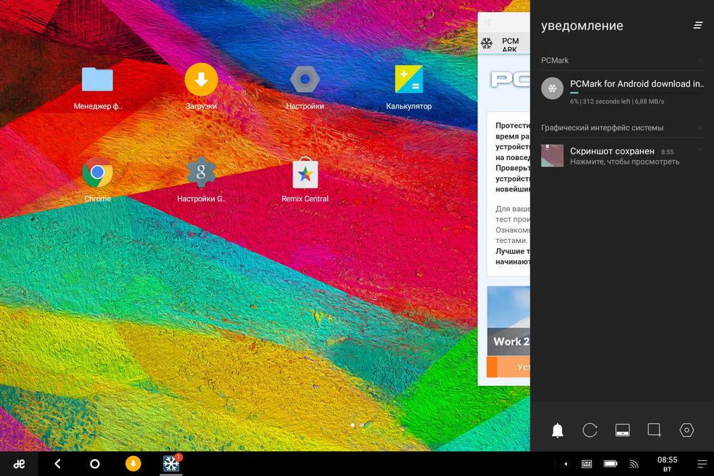Девайс от Chuwi имеет в качестве предустановленных систем две наиболее популярные ОС от Microsoft и Google. При первом взгляде на Remix OS заметно необычное для Android расположение статусной строки в нижней части дисплея, с ярлыками запущенных программ на манер настольных ОС, а также вкладками быстрых настроек в правом углу. Кнопка Пуск в левом нижнем углу содержит в себе все установленные приложения, а сочетание Alt+Tab позволяет перемещаться между окнами на манере Windows. Однако главной особенностью Remix OS является то, что каждое приложение работает в отдельном окне как в той же Windows. Есть и кнопка Свернуть, Развернуть и Закрыть.  Многозадачность полноценная, а предустановленные утилиты уже включают пакет приложений от Гугл. В общем, Remix OS - это Android, выполненный в манере Windows со всеми ее удобствами, поэтому при переходе с одной ОС на другую проблем с адаптацией не возникает вовсе.