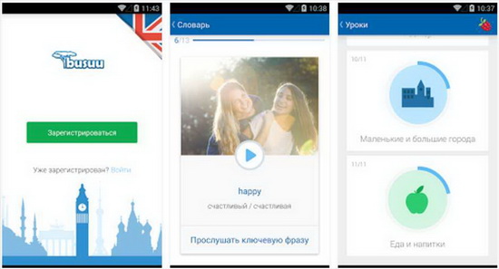Приложение "Учим английский язык" позволяет изучать этот язык через различные аудиозаписи. Хорошее приложение, но тем, кто любит халяву, придётся периодически терпеть рекламу. Крайне рекомендуется тем, кто "запоминает ушами".
